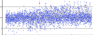 Červená šipka v obrázku ukazuje předpokládaný okamžik zákrytu. Maximální doba trvání na centrální linii byla předpověděna na 0,24 s a očekávaný pokles jasu byl 100 %. Negativní hlášení hovořilo o užití expozice 0,06 s. Minimálně s ohledem na šum, ale také kvůli dlouhému expozičnímu času se jedná o „bezcennou zprávu“. Vyhněte se prosím takovým hlášením – jsou nepoužitelná a zbytečně přidělávají práci revizorům.